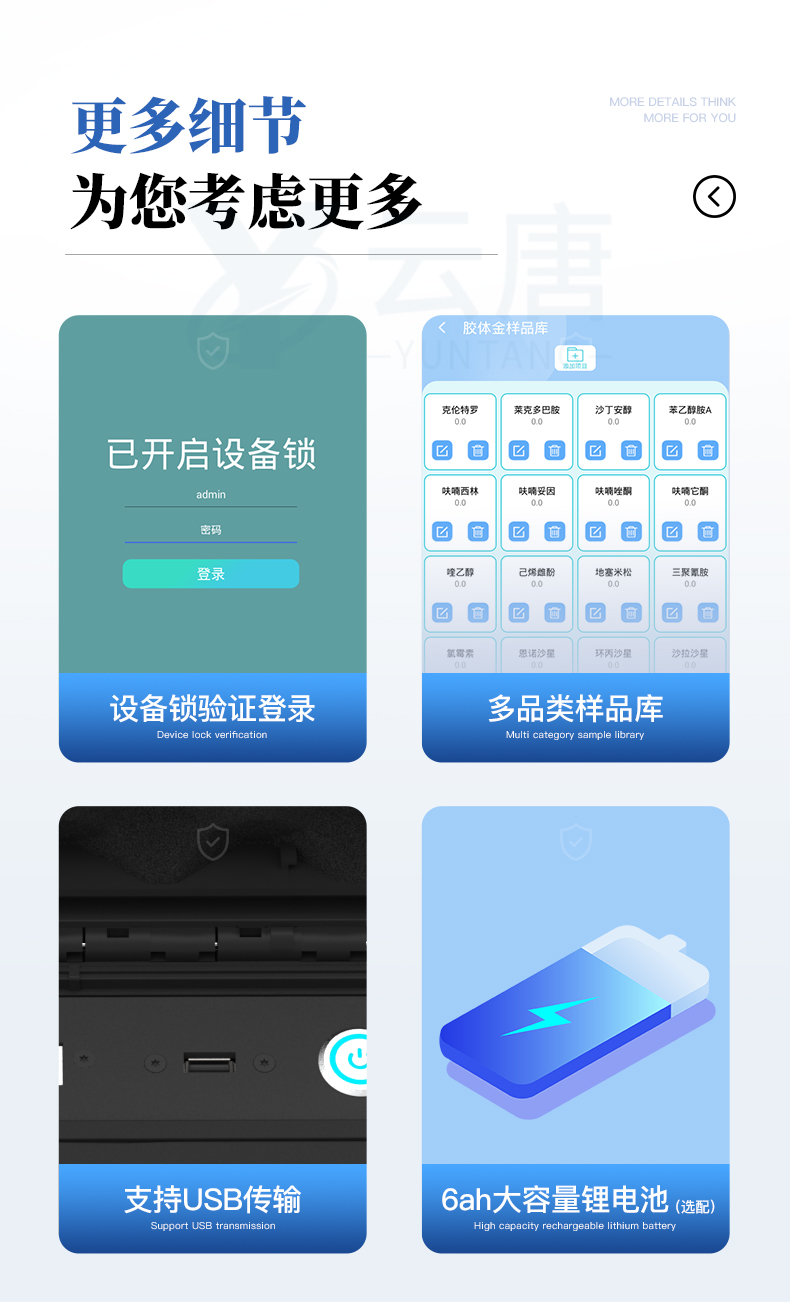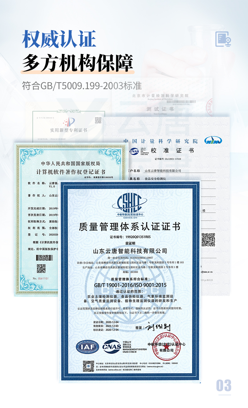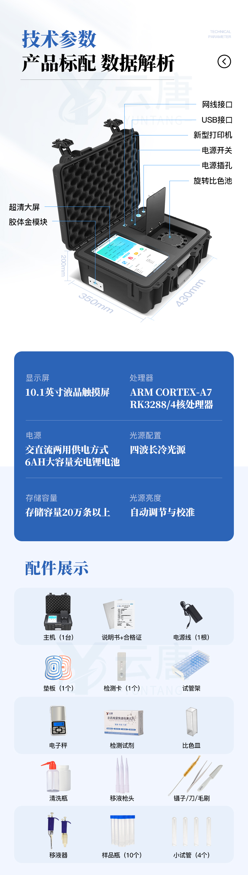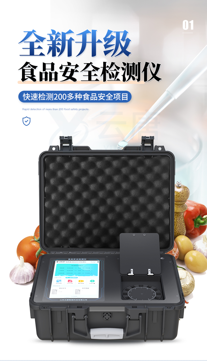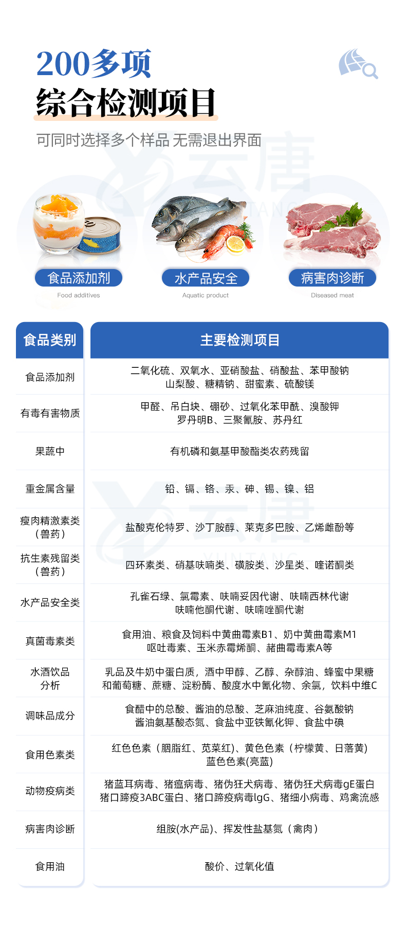 山東云唐智能科技有限公司生產(chǎn)的高智能食品安全檢測(cè)儀可快速檢測(cè)200多種食品安全項(xiàng)目,包含非食用化學(xué)物質(zhì)、濫用食品添加劑、農(nóng)藥殘留、獸藥殘留、重金屬、病害肉、營養(yǎng)強(qiáng)化劑、抗生素類殘留、激素類殘留、真菌毒素類殘留、化學(xué)類殘留等項(xiàng)目的定性定量檢測(cè)。
