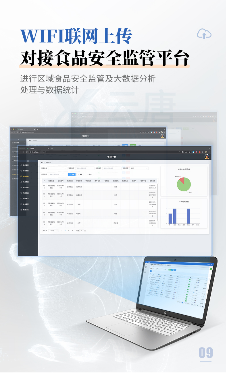 12、儀器具有 wifi 聯(lián)網(wǎng)上傳、RJ45網(wǎng)線連接功能,可以快速上傳數(shù)據(jù)。同步對(duì)接監(jiān)管平臺(tái),數(shù)據(jù)可局域網(wǎng)和互聯(lián)網(wǎng)數(shù)據(jù)上傳,檢測(cè)結(jié)果直接傳至食品安全監(jiān)管平臺(tái)。進(jìn)行區(qū)域食品安全監(jiān)管及大數(shù)據(jù)分析處理與數(shù)據(jù)統(tǒng)計(jì),檢測(cè)區(qū)域食品安全長短期動(dòng)態(tài),達(dá)到食品安全問題預(yù)估、預(yù)警。