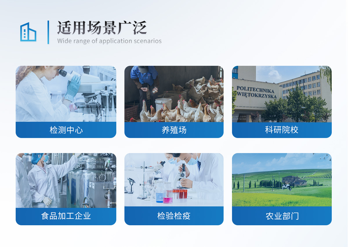 該儀器廣泛應(yīng)用于食藥監(jiān)局、衛(wèi)生監(jiān)督部門、農(nóng)業(yè)部門、商業(yè)系統(tǒng)養(yǎng)殖場、屠宰場、食品肉產(chǎn)品深加工企業(yè)、畜牧獸醫(yī)、檢驗檢疫部門、食品生產(chǎn)企業(yè)、農(nóng)副產(chǎn)品批發(fā)市場、農(nóng)業(yè)生產(chǎn)基地、超市、餐廳、高教院校、食堂等單位部門對食品中的不安全指標(biāo)進行監(jiān)測使用。